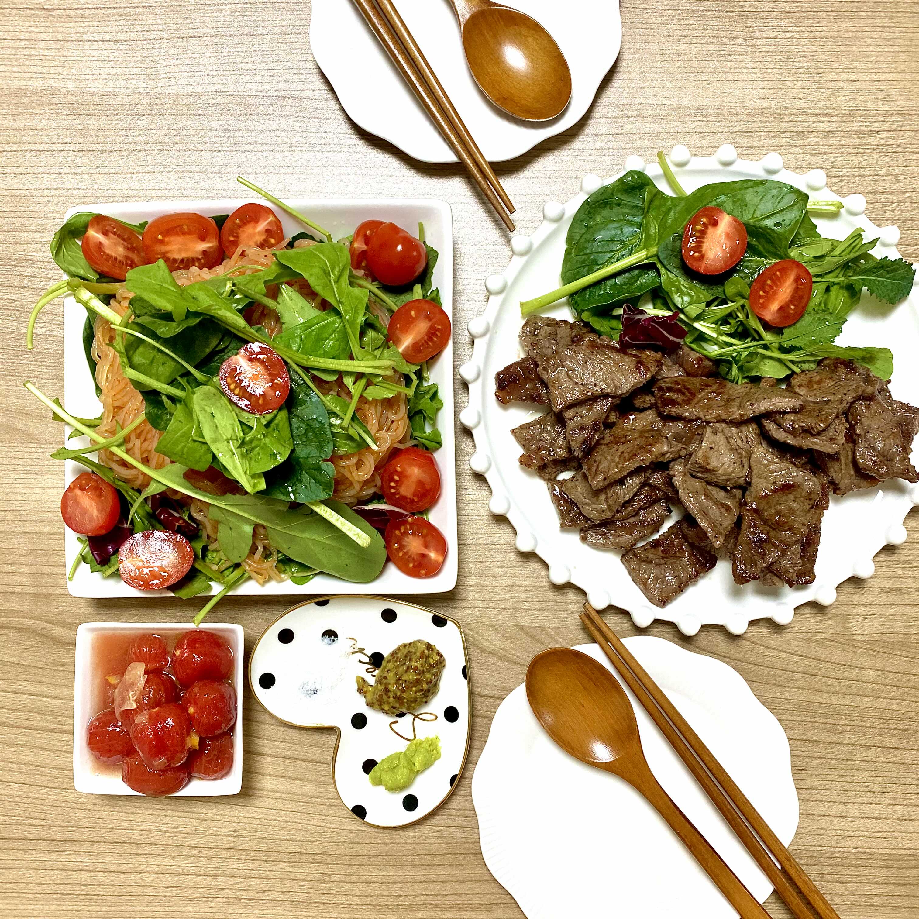 스테이크, 깔조네피자, 리코타치즈샐러드, 와인에이드