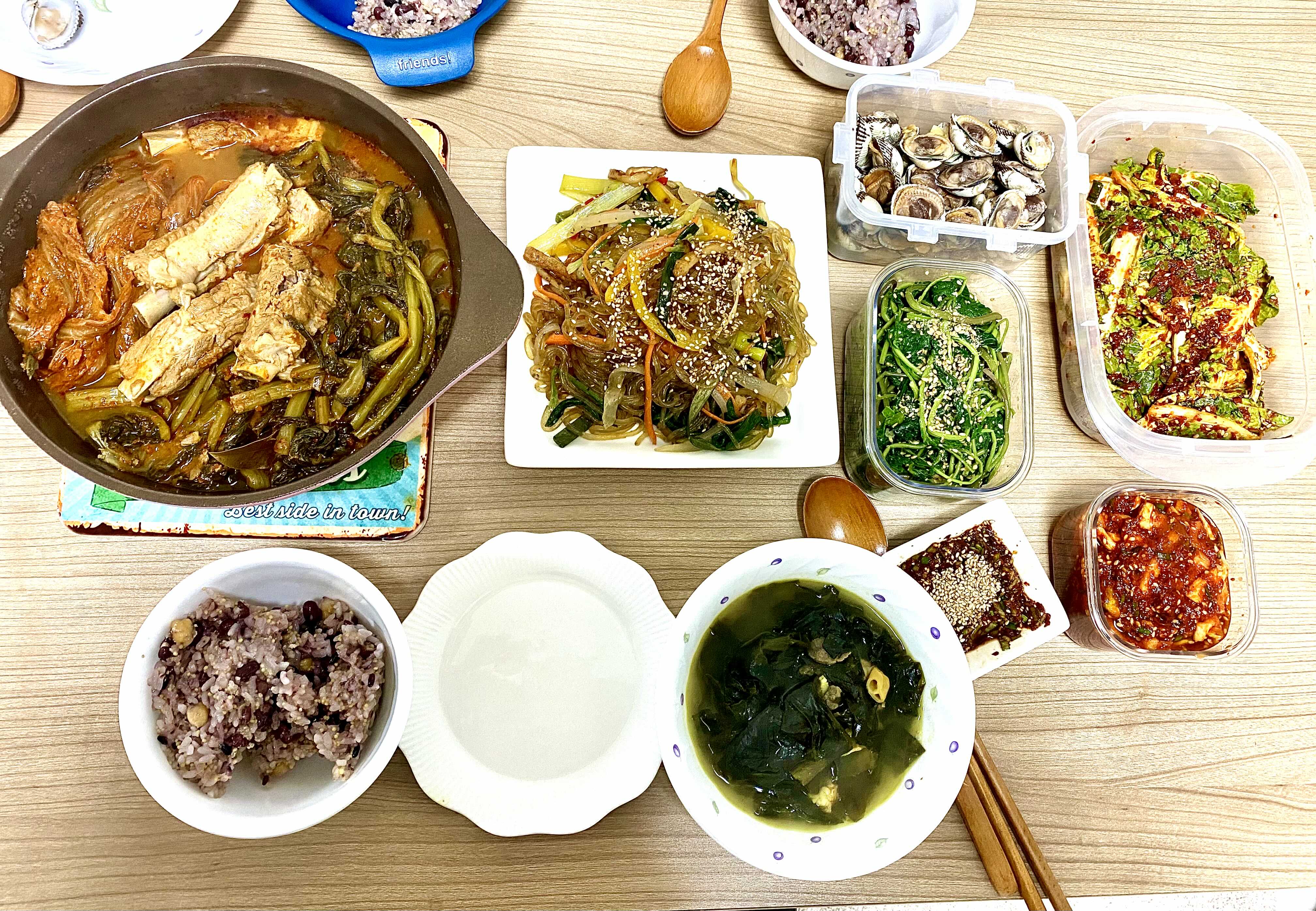등갈비 김치찜, 잡채, 취나물, 무말랭이 봄동 겉절이